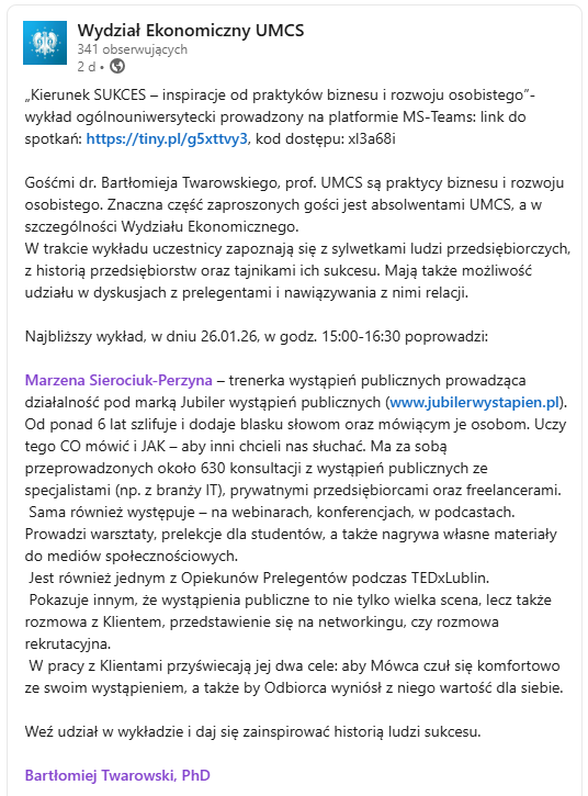 Przy okazji bardzo dziękuję za zaproszenie Panu dr Bartłomiej Twarowski, PhD , prof. UMCS